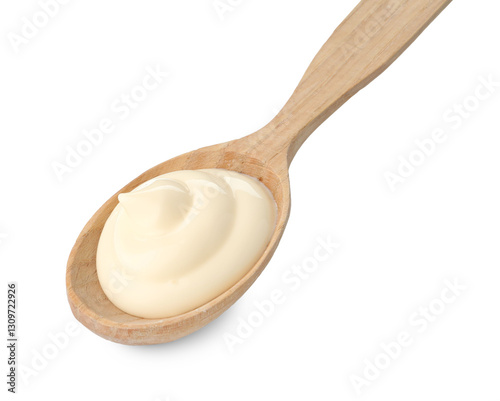 Tasty mayonnaise sauce in wooden spoon isolated on white