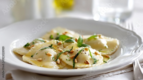 Tasty ravioli with basil and pine nuts rest on a white plate in a bright kitchen.