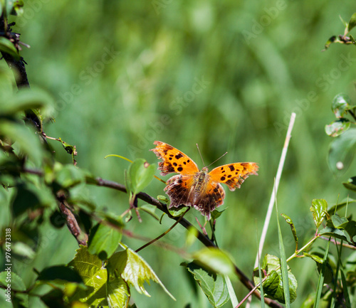 Tattered Orange Butterfly Resting on a Leaf in a Lush Green Field