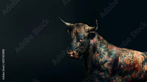 tattoo, bull, horn, japanese, mammal, head, back, person, skin, cow, ink, male, artwork, dangerous, dragon, japan, tradition, wildlife, naked, oriental, ai, herbivore, horned, steer, artistic, colours