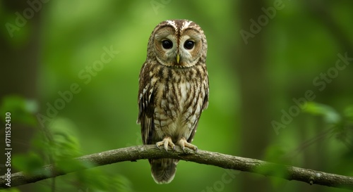 Tawny owl perched on a branch in a lush green forest.