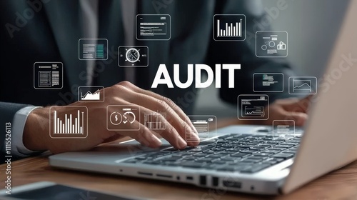 tax finance submission concept. Hands typing on a laptop with digital audit graphics overlay.