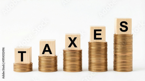 Tax savings concept with wooden blocks and stacked gold coins on white background