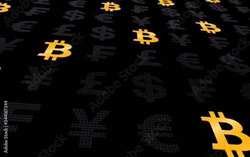 tcoin and currency on a dark background. Digital crypto currency symbol. Business concept. Market Display. 3D illustration