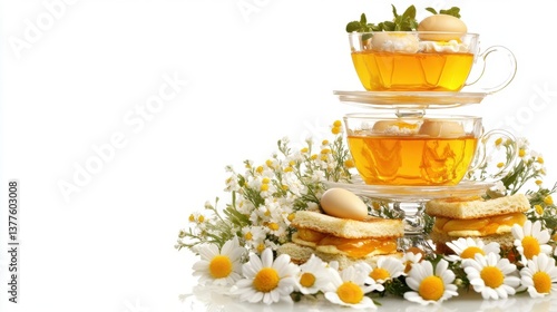 Tea cup and teapot with freshly brewed tea on a wooden table