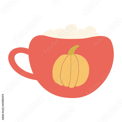 Tea cup with marshmallows hand drawn cartoon illustration. Flat style design, isolated vector. Kids autumn, fall print element, seasonal hot drink, coffee, cocoa, chocolate, beverage