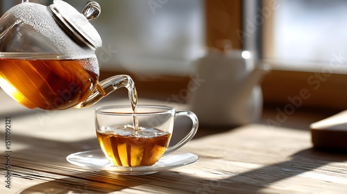 Tea pouring from transparent teapot in sunlit, cozy setting