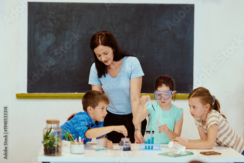 Teacher guides children through a hands-on science experiment in classroom with test tubes and goggles