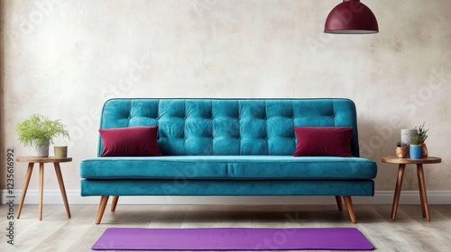 Teal velvet sofa in living room with yoga mat.
