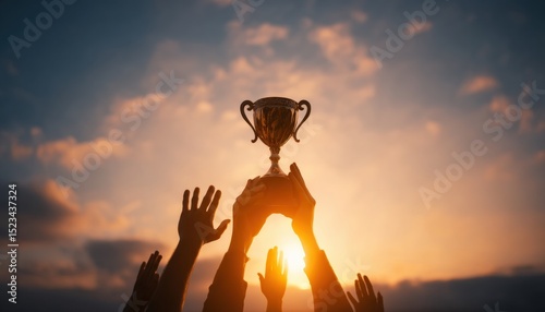 Team members raise a trophy high in victory against a vibrant sunset sky, celebrating their hard earned success