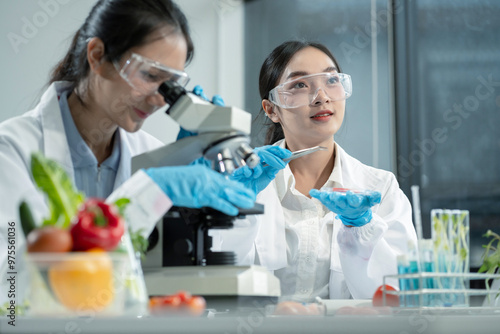 Team Microbiologists Analyzing Molecular Samples in Advanced Food Science Laboratory, Dietitian food and medicine.
