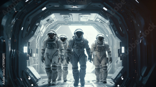 Team of astronauts in a space suits aboard the orbital station. A crew of cosmonauts piloting the spaceship. People in space. Galactic travel and science concept.