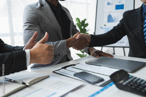 Team of businessmen, investors congratulate their teammates for successful performance in finance, stocks, marketing in a stand out with shaking hands in modern office.