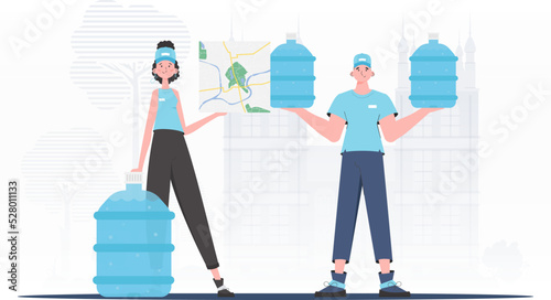 Team specializing in the delivery of water. Modern trendy style. Vector.
