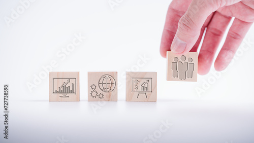 Team work to be success concept, wooden blocks with icons and man hand putting people icon which is the most important and powerful to drive the organisation to be successful