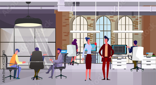 Team working on project in modern office. Loft, contemporary studio, corporate discussion flat vector illustration. Cooperation, teamwork concept for banner, website design or landing web page