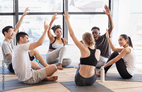 Teambuilding And Motivation. Young People Voting With Raised Hands In Fitness Studio