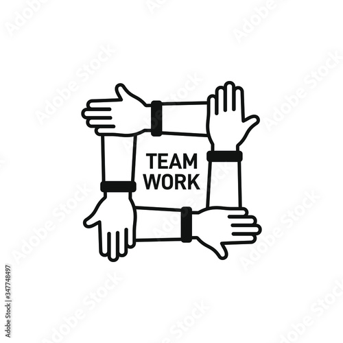 Teamwork icon. 4 hands hold on each other isolated on white background. Vector illustration