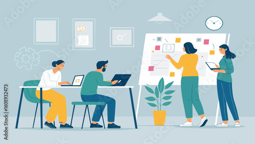 Teamwork in a modern office: Illustration perfect for websites, presentations, and marketing materials.