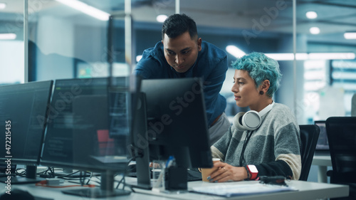 Teamwork In Diverse Office: Project Manager Talks with Creative Solutions Specialist, They Discuss Design Shown Desktop Computer. Professionals Create Modern Content, e-Commerce Social Media Strategy