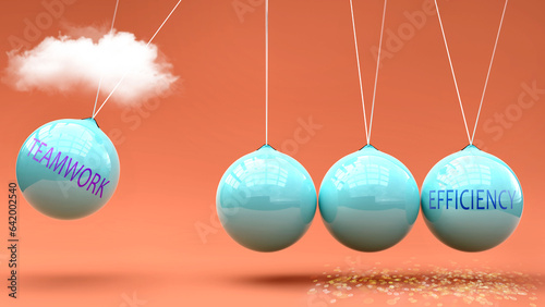 Teamwork leads to Efficiency. A metaphor in which Teamwork gives power to set Efficiency in motion. Cause and effect relation between them.,3d illustration