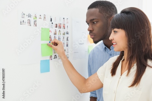Teamwork standing and taking sticky notes