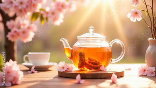 teapot filled with tea sitting on top of a wooden table, accompanied by a cup and saucer, a flower vase with a plant in it, and a few flowers scattered around.