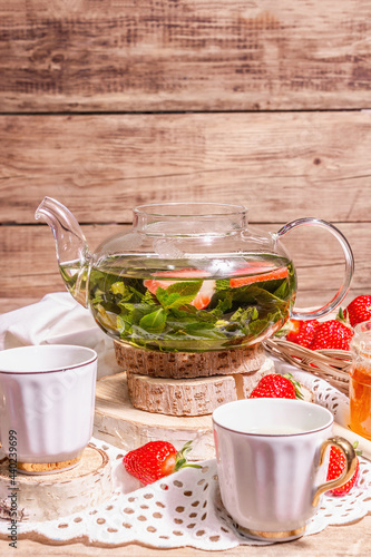 Teatime concept with aromatic mint tea, ripe strawberries, sweet honey