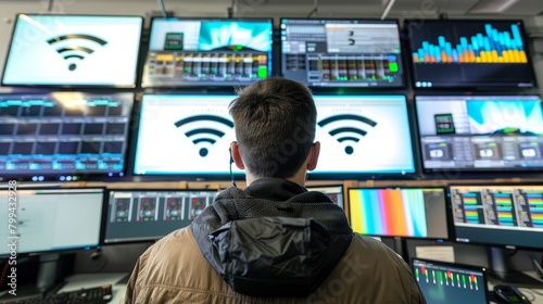 Tech Guru Network Specialist Monitoring WiFi 7 Traffic in HighTech Control Room