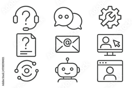 Tech Support Icons. Line style icons of tech support for students: headset with question, chat support icon, troubleshooting gear,