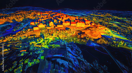Technical aerial visual, 3D LiDAR GIS aerial map satellite scan model isolated, showing Sosnowiec, Poland. Elevation, topography, render