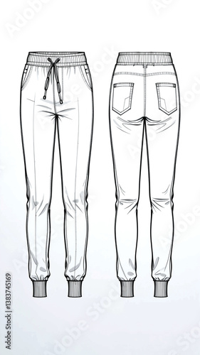 Technical fashion illustration of women's joggers with drawstring waistband and ribbed cuffs.