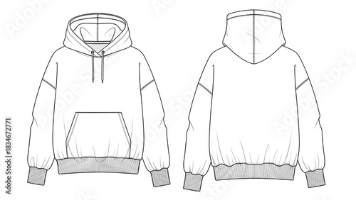 Technical sketch of an oversized hoodie front and back view vector illustration