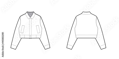 Technical Vector Flat Sketch: Cropped Shirt-Collar Jacket with Welt Pockets (Front and Back View)