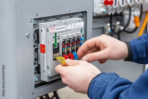 Technician connects wires in an electrical panel during installation, showcasing precision, technology, and electrical maintenance work.