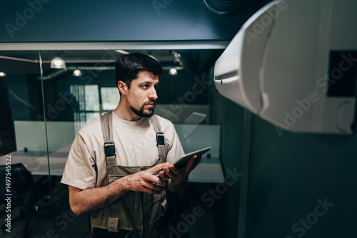 Technician evaluates equipment with a tablet in a modern office environment during working hours
