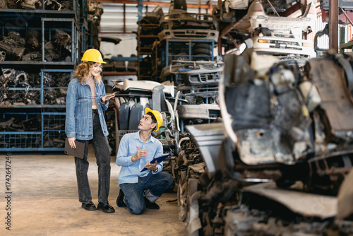 Technician male worker working in garage scrap yard old car part workshop warehouse