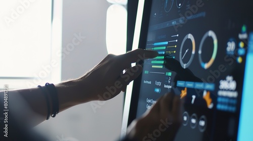 Technician monitoring energy consumption on a digital dashboard, close-up of screen and fingers, office light.