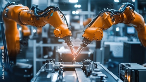Technicians assembling and installing robotic systems in a modern factory.
