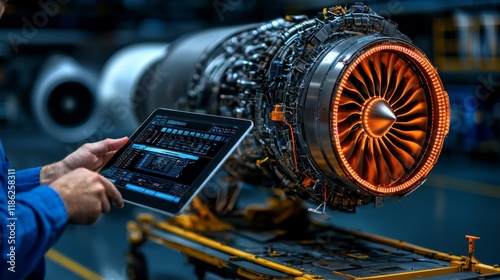 Technicians inspect aircraft engine components using tablet in maintenance facility