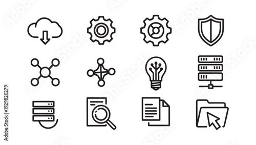 Technology Icons Set: Cloud Gears Network Lightbulb Server Security Search File