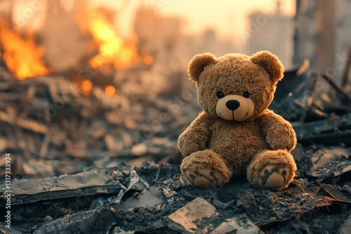 Teddy bear amidst urban ruins at sunset. Artificial Intelligence image