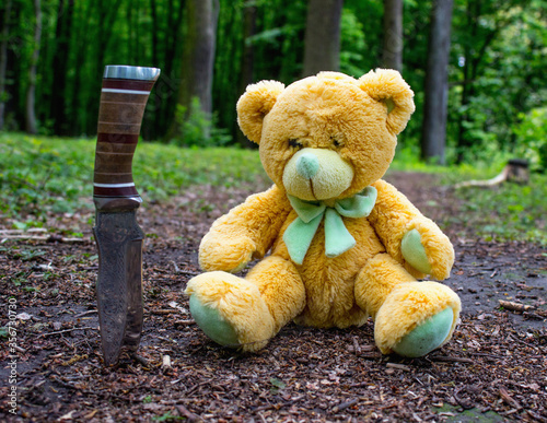 Teddy bear in the woods with a knife. Symbol of loneliness and aggression. For the moderator: an old bear without a brand