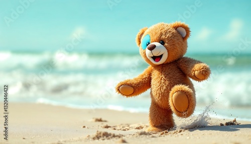 Teddy Bear Running on the Beach with Blue Sea Background
