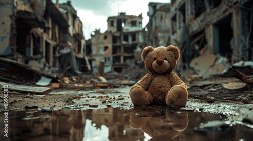 Teddy bear sits amidst the ruins of a wartorn city symbolizing the impact of conflict on innocent lives