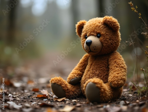 Teddy bear sitting alone in the woods feeling lost and abandoned