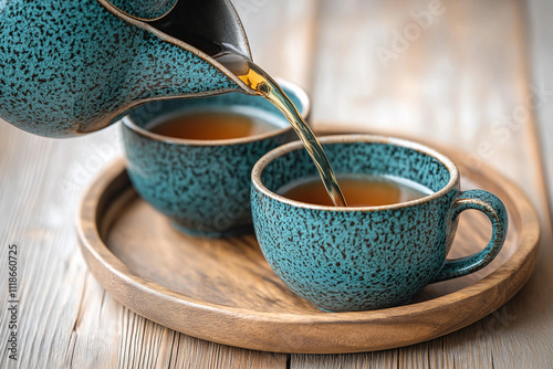 Teekanne mit zwei Tassen auf einem Holzbrett