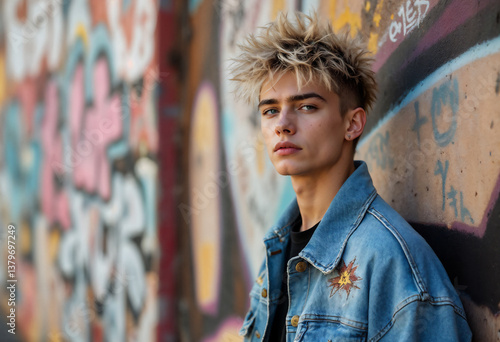 Teen boy posing in front of graffiti wall