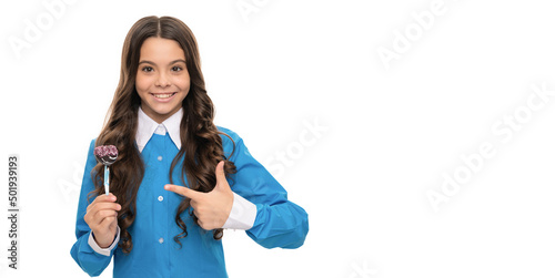 teen dental care. sweet tooth. yummy. girl isolated on white. smiling child point finger