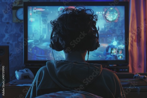 Teen enjoying gaming on a large screen with headphones on in a cozy room. It captures the gaming culture lifestyle. Perfect for technology, entertainment, or lifestyle projects. Generative AI